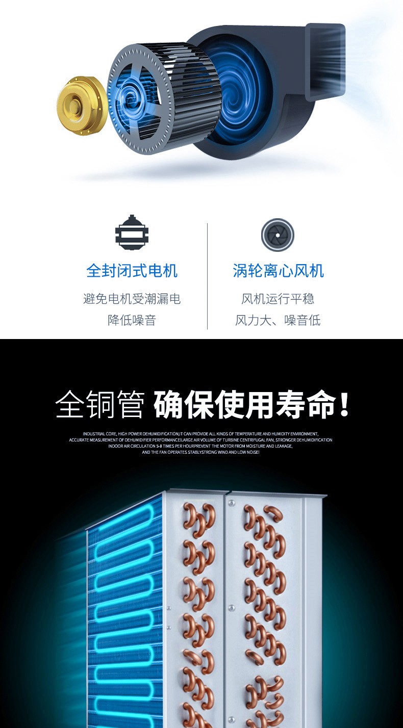 采用亲水铝箔翅片内螺纹多排铜管,使结水面积更大,大幅提升除湿效率。
